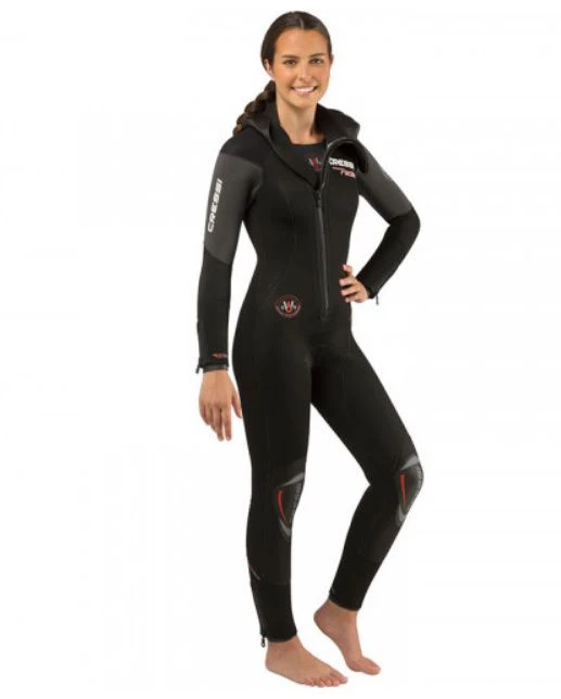 Combinaison humide mono-pièce avec épaisseurs différenciées (8, 6 et 5 mm) avec cagoule intégrée pour eaux froides.