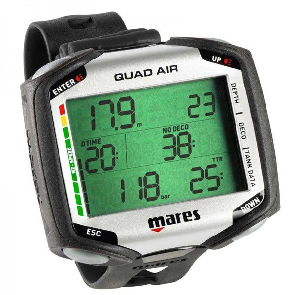 Nouvel Ordinateur Mares Quad Air doté de toutes les fonctionnalités du Quad ( Air / Nitrox / Mix Gaz / Bottom Timer ) et proposant en option un couplage avec une sonde LED transferant les informations de pression du bloc , de consomation mais aussi d’autonomie .